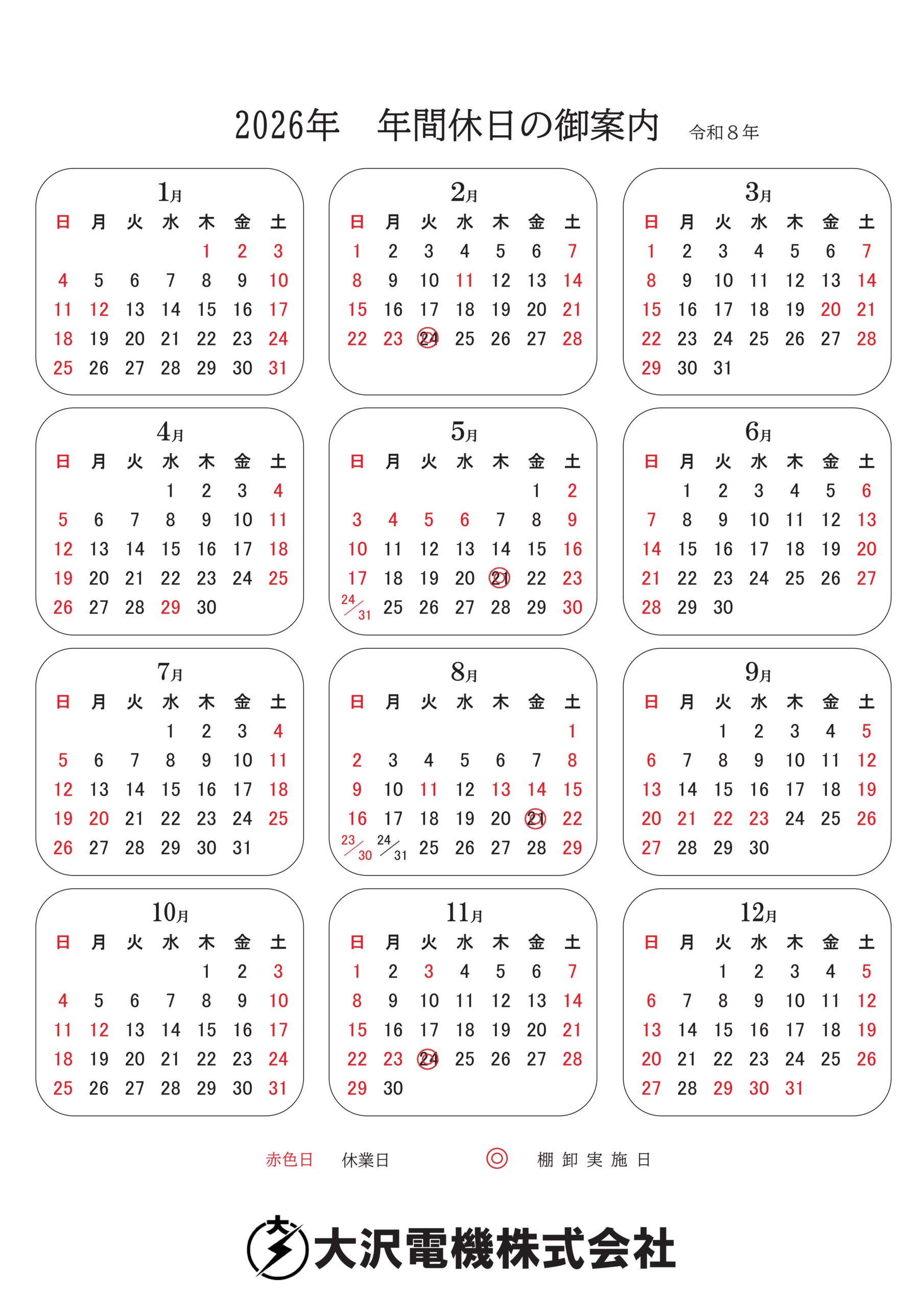 2026年営業日カレンダーを追加しました